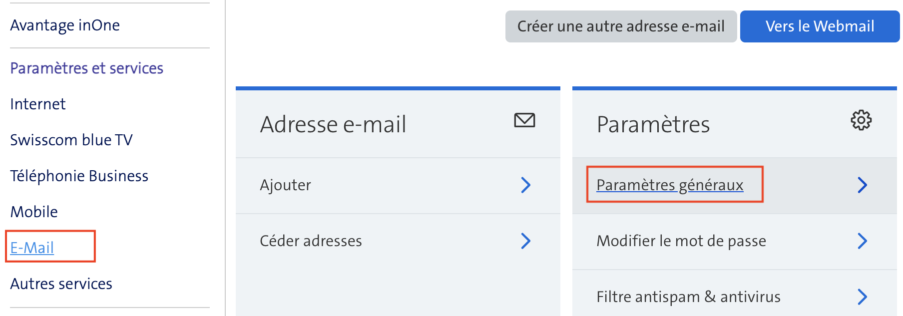 Connectez-vous à l’espace client Swisscom, cliquez sur le menu « Emails » à gauche, puis sur « Paramètres généraux » à droite :