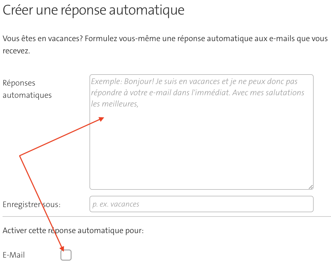 Et vous pourrez saisir votre message envoyé automatiquement à vos correspondants. Notez qu’il ne faut pas oublier de cocher la case tout en bas qui indique quelles adresses @bluewin.ch sont concernées par répondeur.