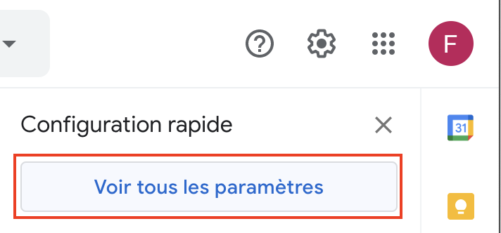 Pour activer un répondeur automatique sur votre adresse @gmail.com, il vous suffit d’ouvrir le menu « Réglages » en haut à droite :