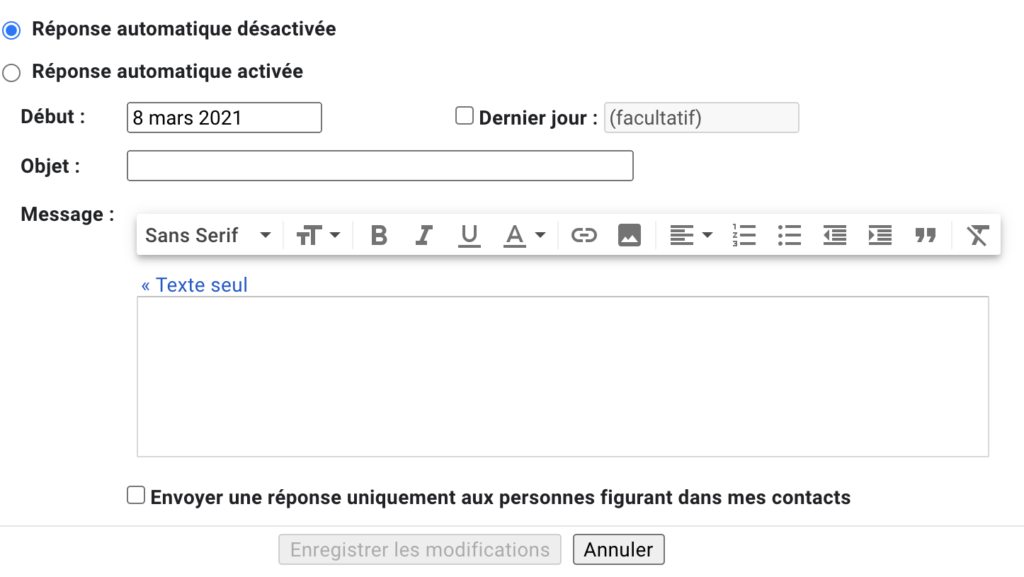 Vous pouvez indiquer une date de mise en service (ou de fin si nécessaire), le sujet et le texte de la réponse automatique que vos correspondants recevront.