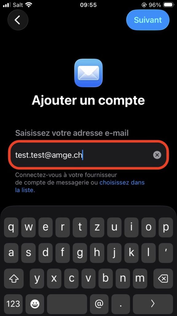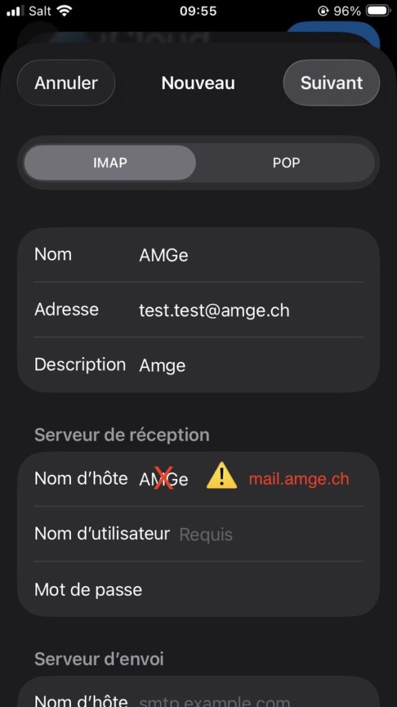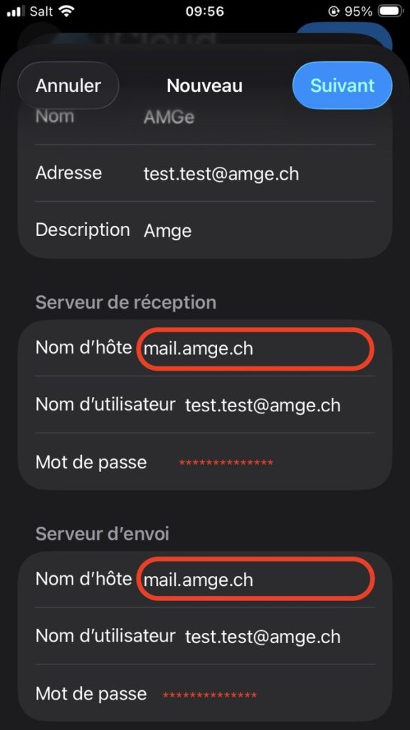 ⚠️ Attention, Apple pré-rempli automatiquement le premier champ « Serveur de réception – Nom d’hôte » avec une valeur erronée. Remplacez la valeur par « mail.amge.ch ».