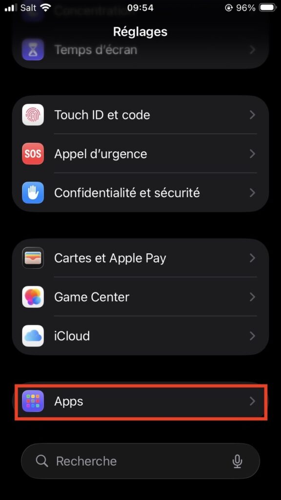 Ouvrez les « Réglages » de votre iPhone/iPad, défilez jusqu’en bas et choisissez « Apps » :