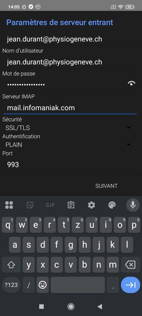 - Saisissez le serveur IMAP « mail.infomaniak.com »