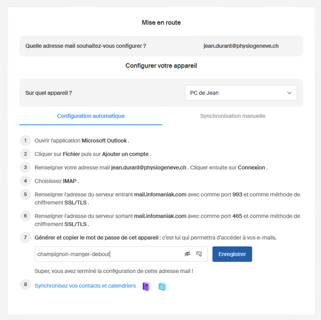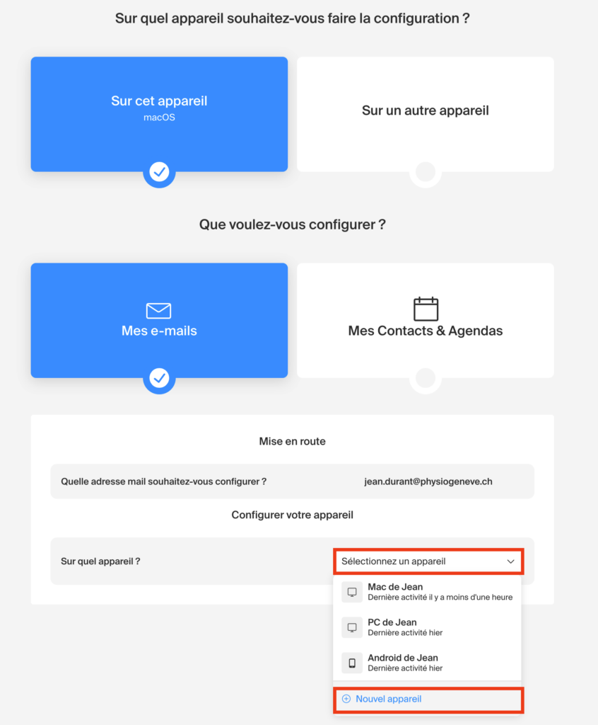 Sur le site : https://config.infomaniak.com/, choisissez l’option « Sur cet appareil » et « Mes e-mails ».