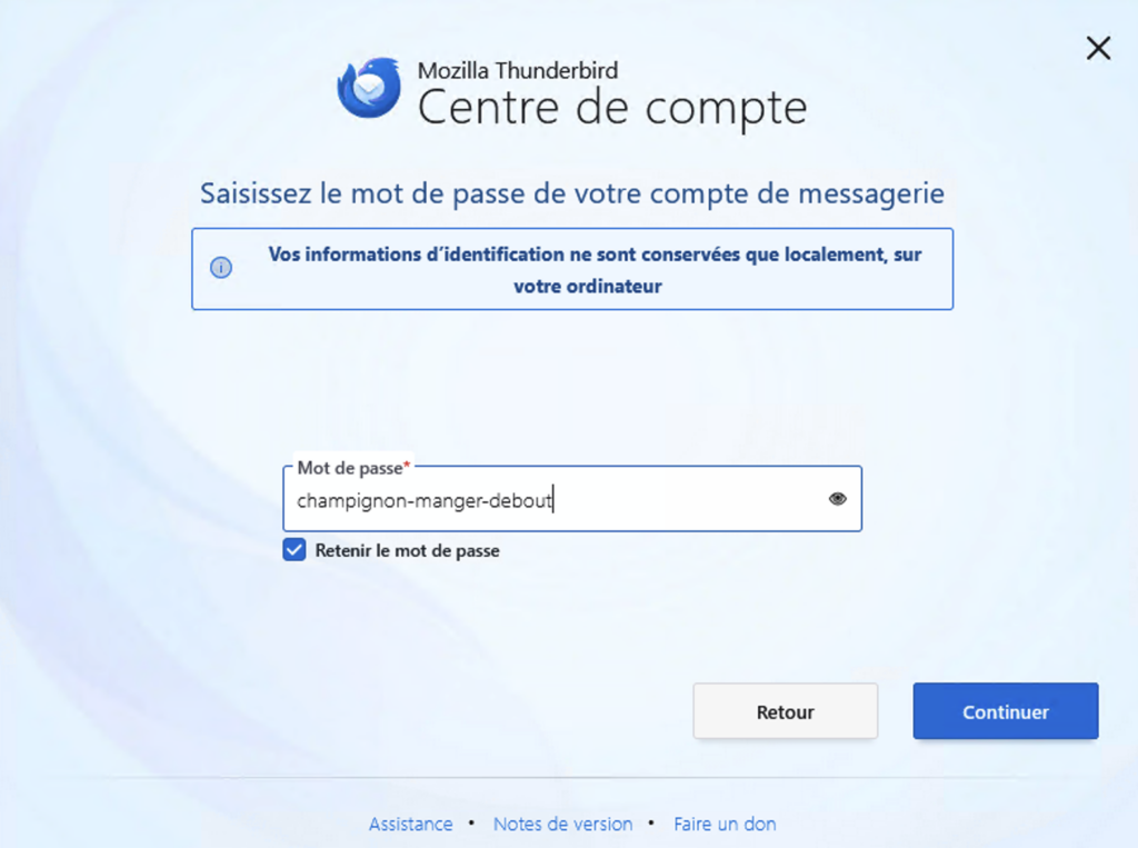 Saisissez votre mot de passe généré depuis la console Infomaniak et sélectionnez « Continuer ».