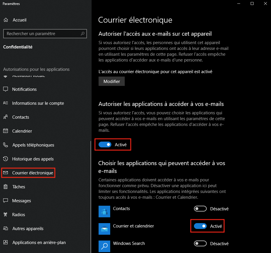 Pour utiliser votre nouvelle adresse avec le logiciel par défaut “Courrier” qui est installé avec Windows 10, il faut tout d’abord vous assurer que les réglages de confidentialité soient comme sur la capture d’écran suivante :