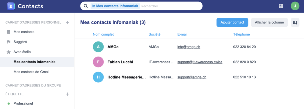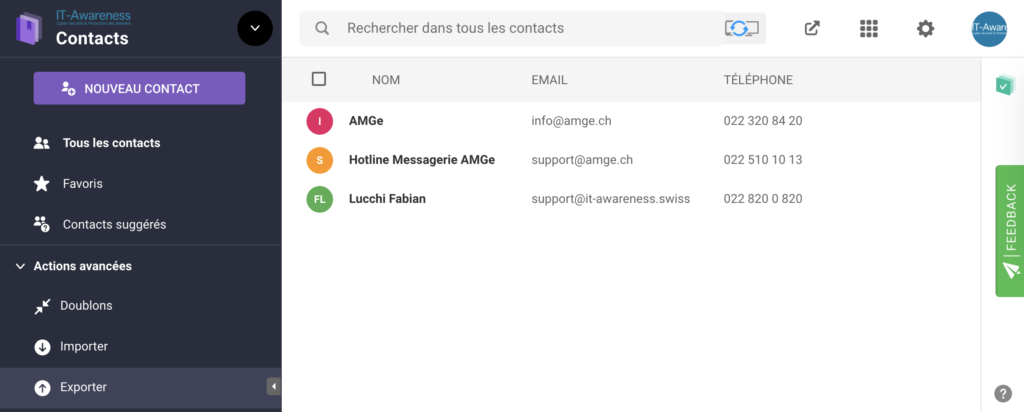Pour copier vos contacts depuis le Workspace d’Infomaniak sur la messagerie sécurisée de l’AMGe, connectez-vous au Workspace, puis à la gestion des Contacts, dépliez le menu « Actions avancées » sur la gauche et choisissez « Exporter » :