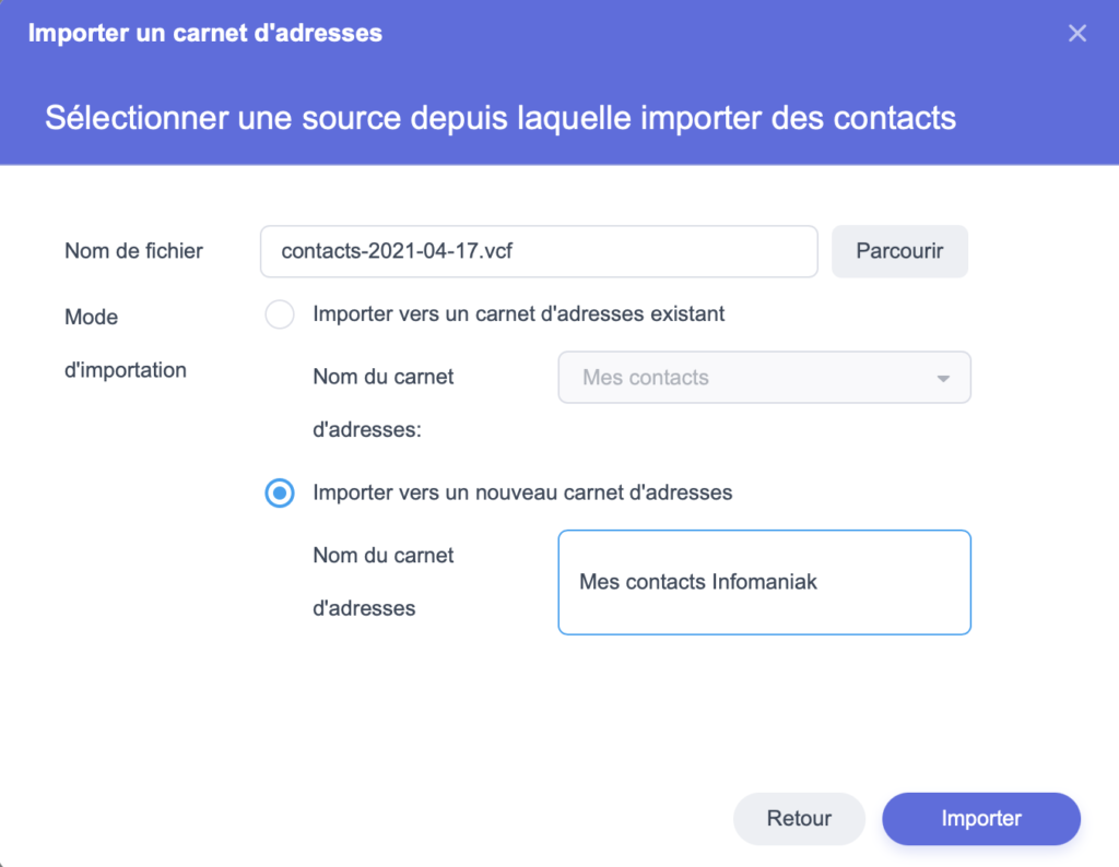 et choisissez le fichier vCard téléchargé à l’étape précédente. Vous pouvez choisir si vous importez ces nouveaux contacts dans le groupe principal ou si vous créez un nouveau groupe comme dans l’exemple ci-dessous :
