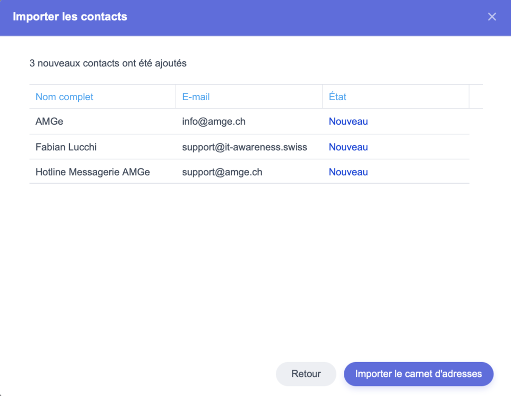 La liste des contacts vous sera alors présentée avec une indication des nouveaux contacts et de ceux qui auront été identifiés comme déjà existants dans votre liste :