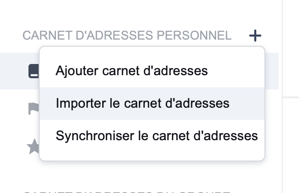 Rendez-vous ensuite dans la gestion des contacts de la messagerie sécurisée de l’AMGe sur https://contacts.amge.ch, cliquez sur le signe « + » à côté de « Carnet d’adresses personnel » et choisissez « Importer le carnet d’adresses » :