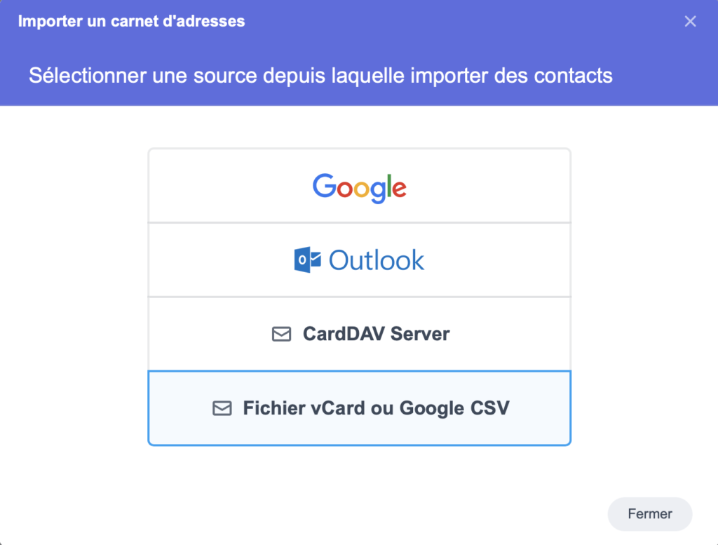 Sélectionnez le format « Fichier vCard ou Google CSV » :
