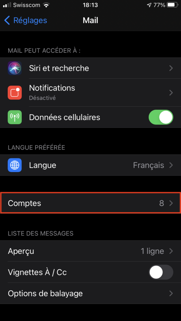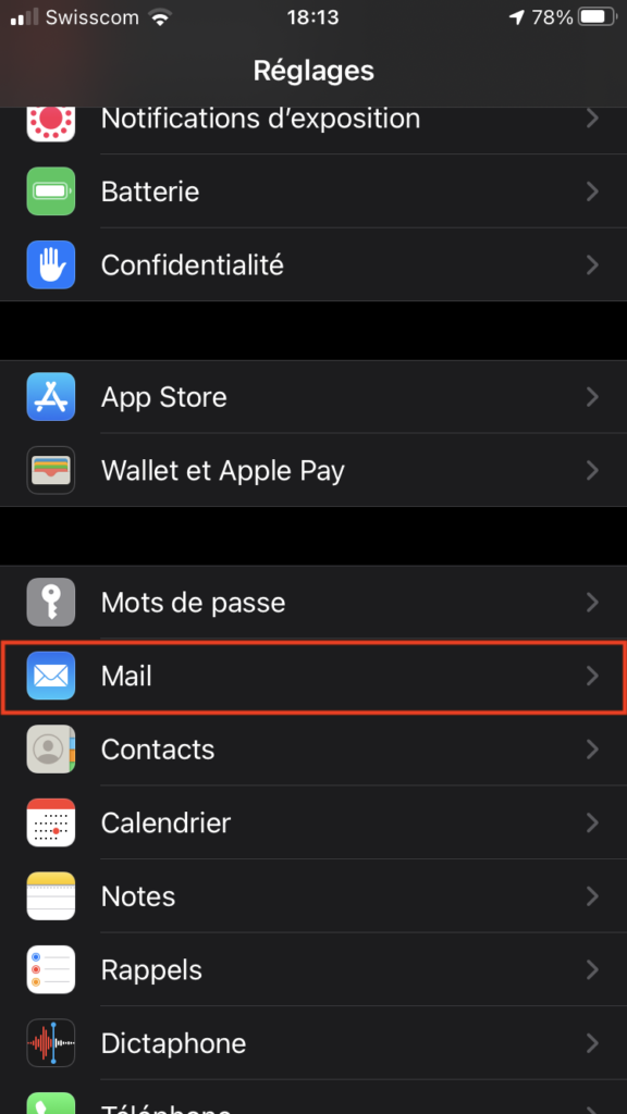 Ouvrez les « Réglages » de votre iPhone/iPad et choisissez « Mail » :