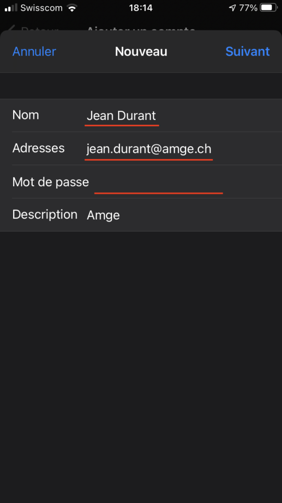 Indiquez vos noms et prénom, votre adresse sécurisée et le mot de passe que vous avez choisi, puis touchez « Suivant » en haut de l’écran :