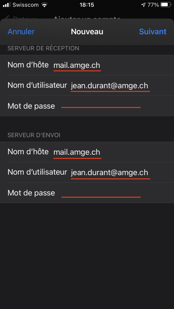 Pour les deux sections en bas de l’écran, « Serveur de réception » et « Serveur d’envoi », indiquez exactement les mêmes informations, soit « mail.amge.ch » comme « Nom d’hôte », votre adresse sécurisée comme « Nom d’utilisateur » et votre mot de passe.