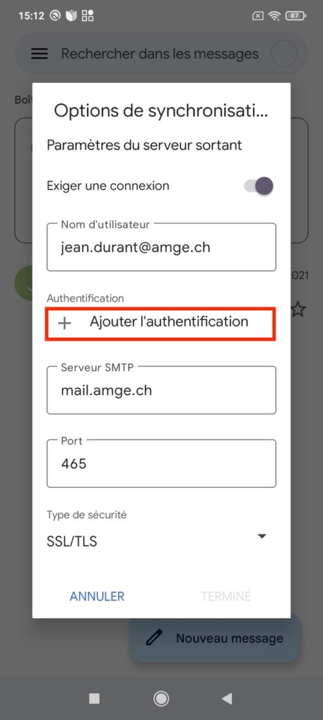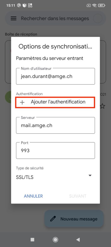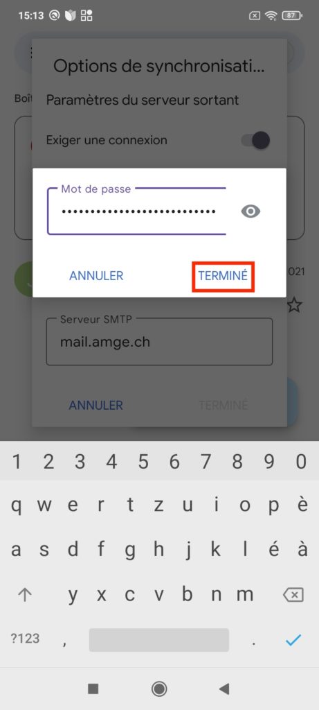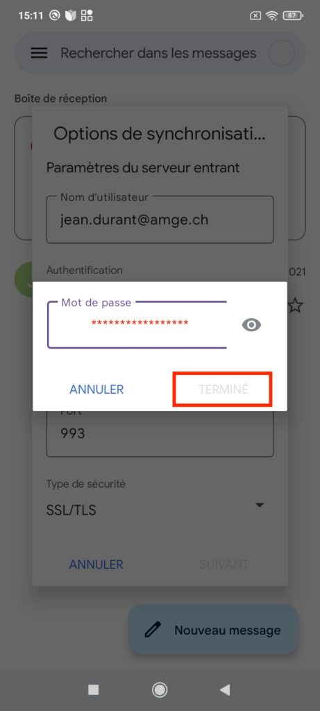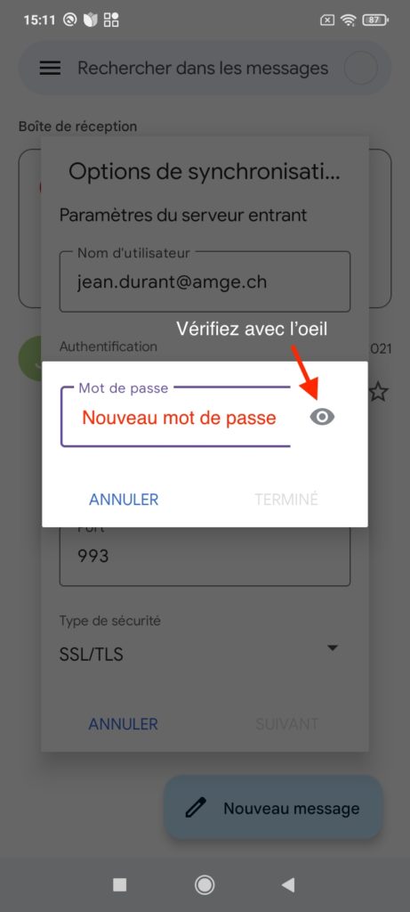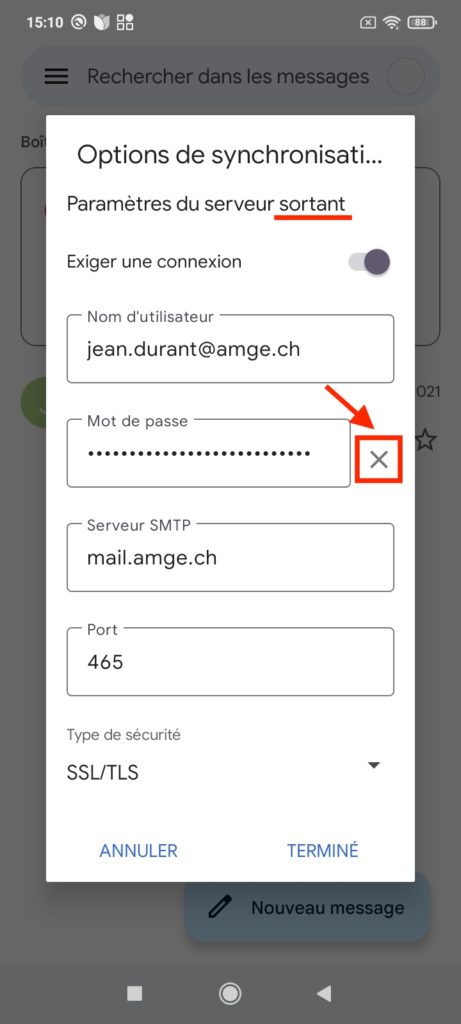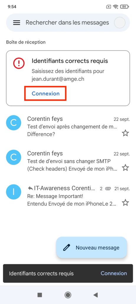 Reconnecter la messagerie sur Gmail (Android) après un changement de mot de passe 2929.0909.23232323 Aller au contenu principal Réponses aux questions fréquentes (FAQs) Rechercher Categories Questions générales 16 Installation 11 Mots de passe 10 Messagerie HIN 8 Votre ancienne messagerie 8 Courrier indésirable 5 Limites d'utilisation 10 Logiciels de messagerie 10 Apps pour iOS et android 14 Assistance 5 < Retour Gmail Pour rétablir le bon fonctionnement de Gmail, il faut remettre le nouveau mot de passe à 2 endroits pour le courrier entrant puis pour le courrier sortant. 1 2 3 4 5 6 7 8 9 La connexion est maintenant rétablie correctement