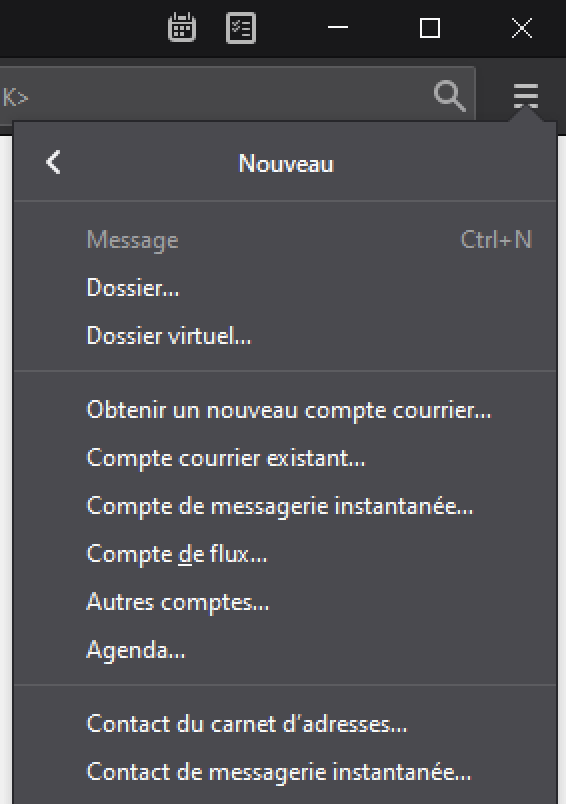 Démarrez Thunderbird et ouvrez le menu à trois barres en haut à droite et cliquez sur « Nouveau » :