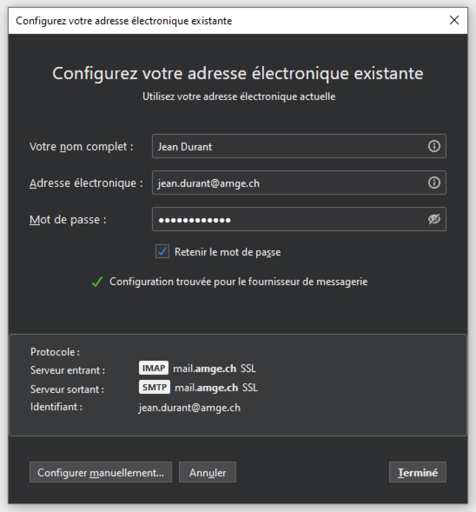 Tous les réglages ont été détectés automatiquement et vous pouvez cliquer sur « Terminé ». Votre adresse sécurisée est prête :
