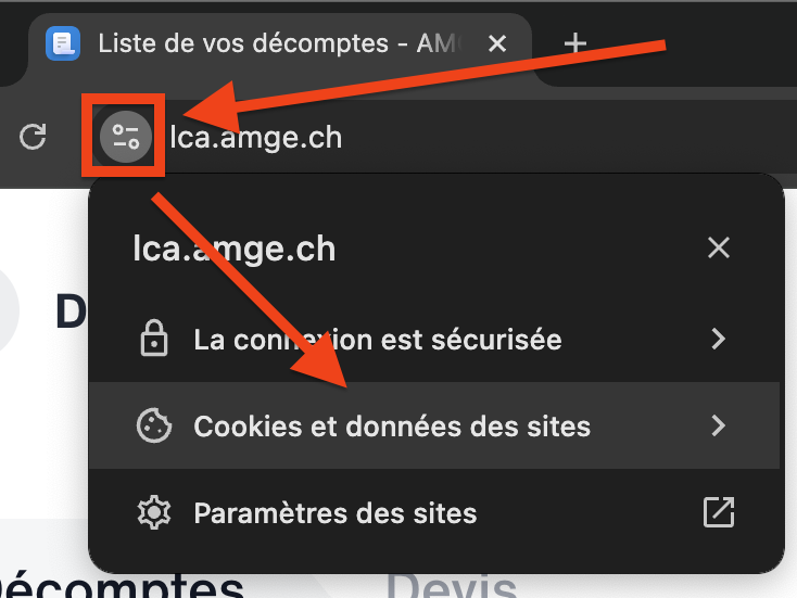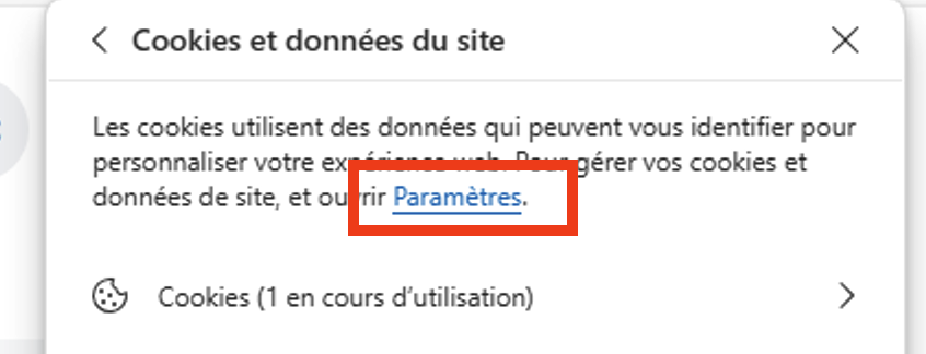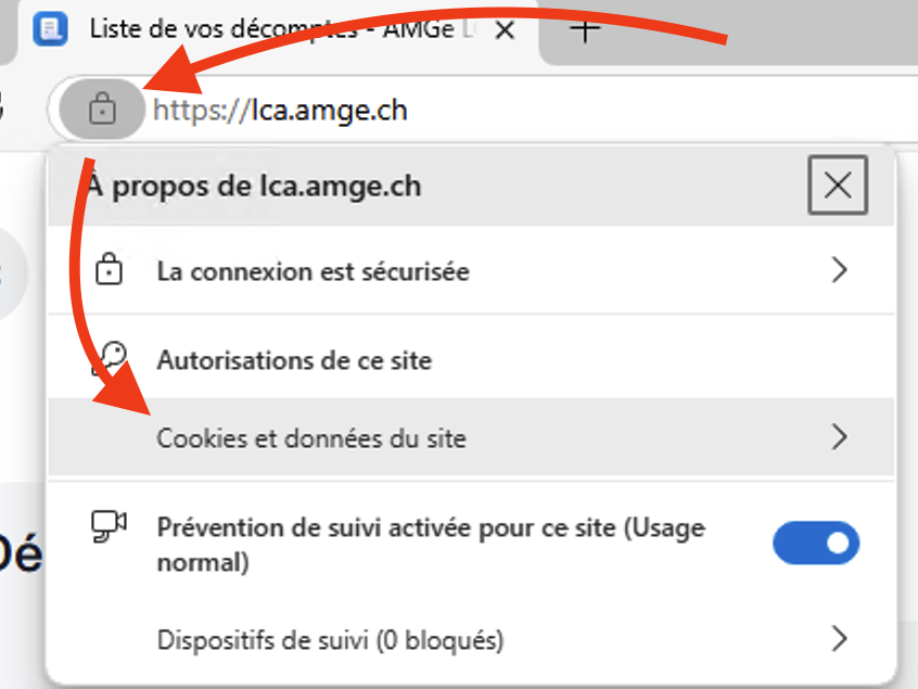 2. Cliquez sur le petit cadenas dans la barre d’adresse en haut de la fenêtre (à gauche du « https ») puis sur « Cookies et données du site »