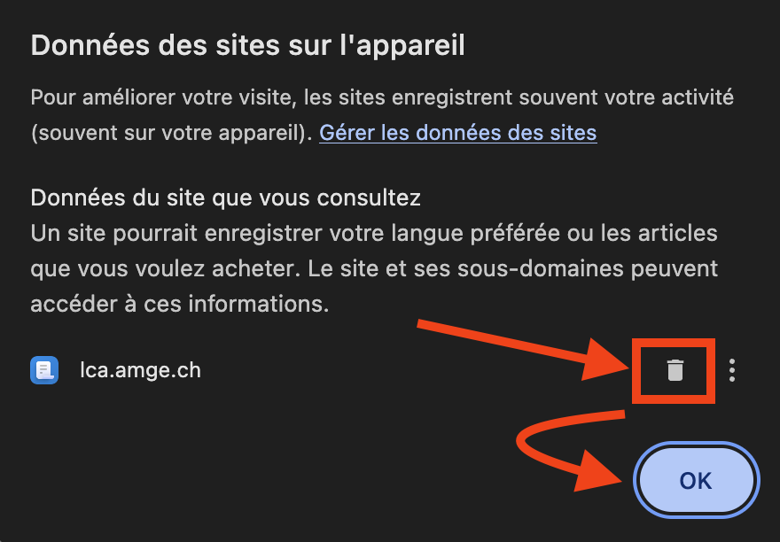 5. Supprimez les données en cliquant sur la petite poubelle puis validez avec « OK »