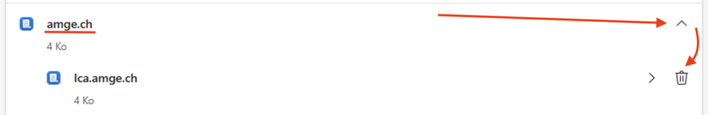 5. Trouvez la ligne « amge.ch » et déroulez-la puis cliquez sur la petite poubelle